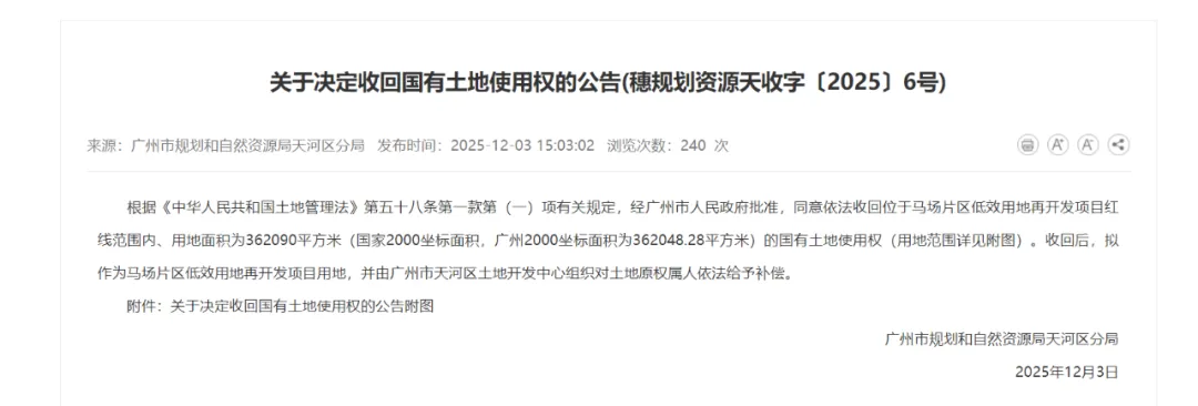 继马场地块拟补偿100亿元、官方正式审议通过规划后,近日广州市人民政府同意依法收回马场36万方地块,这意味着离马场地块正式挂牌已经不远了。