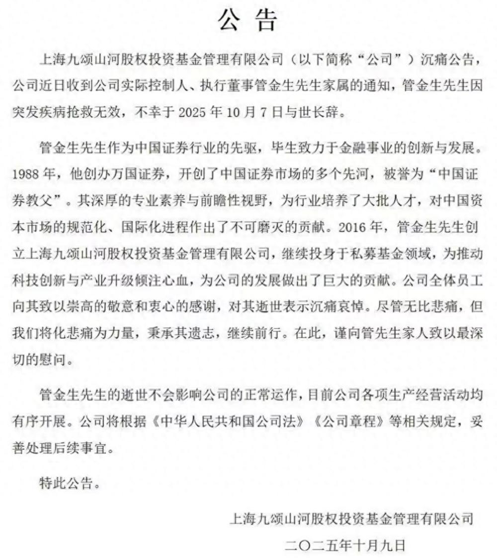 DoNews10月10日消息,10月9日深夜,上海九颂山河股权投资基金管理有限公司通过微信公众号发布公告,公司实际控制人、执行董事管金生因突发疾病抢救无效,不幸于2025年10月7日与世长辞。