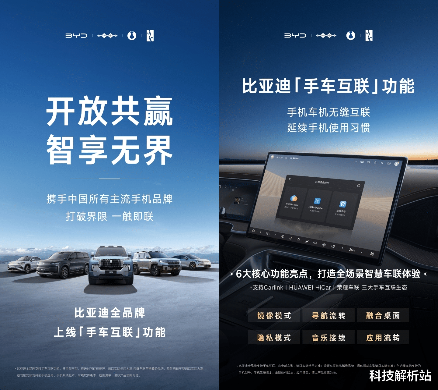 比亚迪的手车互联整合了三大主流互联协议。其中,Carlink适用于OPPO、vivo、小米、一加等品牌;华为HiCar适配华为手机;荣耀车联则适配荣耀手机。