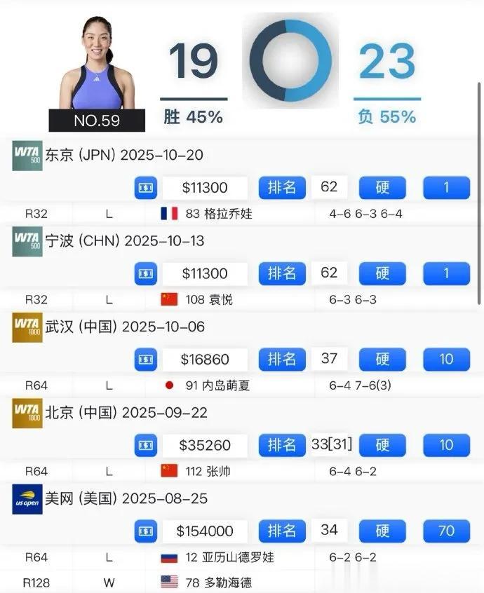 王欣瑜在东京又输球了,比分是6-4、3-6、4-6,输给了从资格赛打上来的格拉乔娃,先赢一盘,然后被逆转,剧本和她最近几