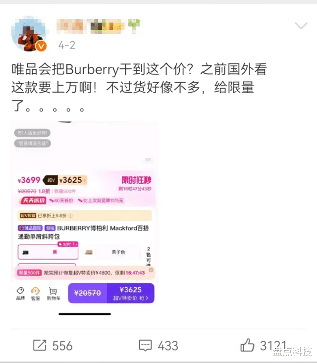 之前在网上冲浪的时候,刷到唯品会居然把巴宝莉女包的价格都打到2折。原本有点疑惑一个小平台怎么可能将奢侈品打折到这么低,但后面有刷到有网友竟然2000左右就拿下了原本上万的包。