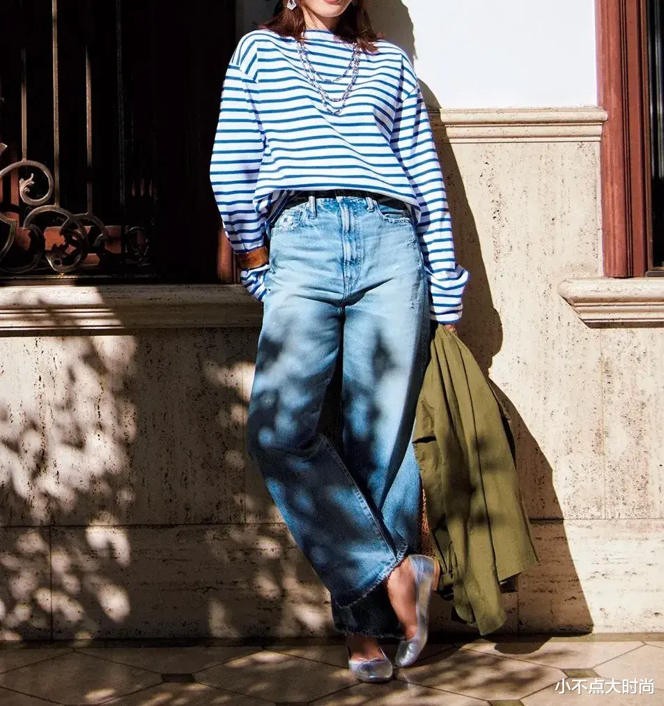 蓝色条纹衫清爽干净,简约耐看有细节,搭配牛仔高腰阔腿裤,显高显瘦,时尚休闲感,减龄又有随性松弛感,时尚大方。▼
