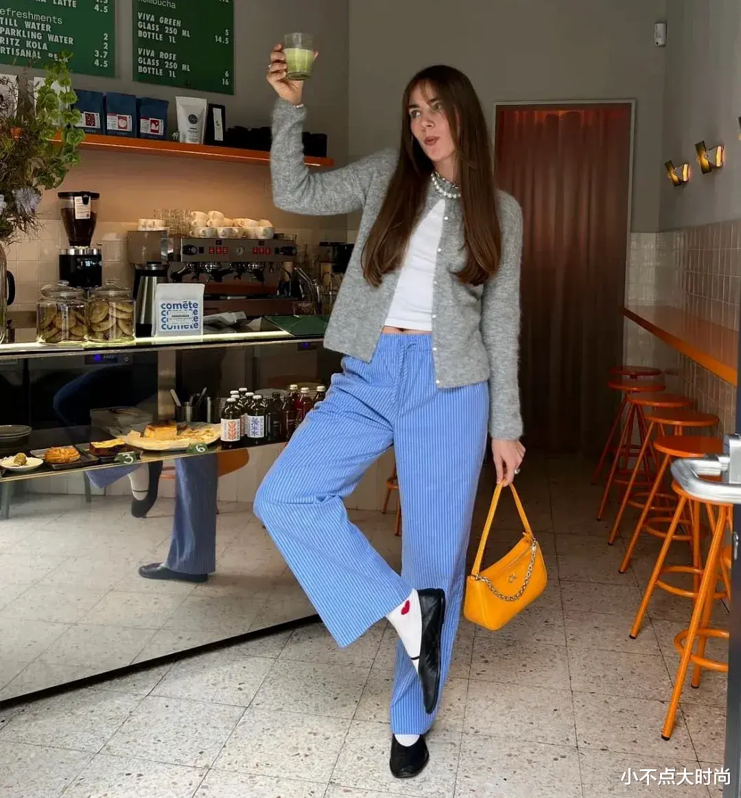 灰色的薄款针织衫很百搭,内搭白色短上衣、下身搭配蓝色条纹高腰裤,内搭提高腰线显高又显瘦。整套穿搭简约大方又有时尚细节,耐看又显气质。▼
