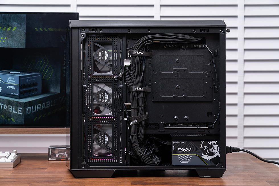 得益于电源标准的体型以及压纹线材质的模组线,无论是电源的安装还是走线都非常便利。对于中塔机箱来说,有足够的空间容纳多余的线材,就以本次进行装机的微星 MAG PANO M100R PZ而言,标准的中塔ATX机箱,整机尺寸为440x235x405mm,背面空间充裕配合理线梳和机箱自带的卡扣,能让机箱背部走线显得非常清爽。