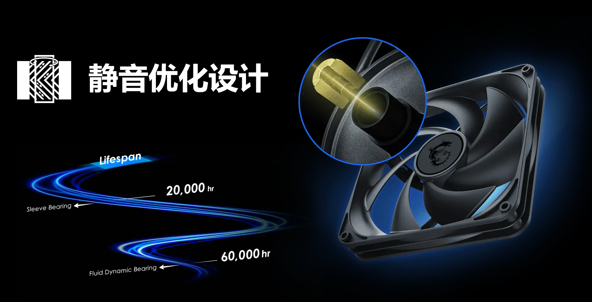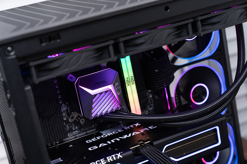 散热方面搭配微星 MAG CORELIQUID A15 360 水冷,冷头外观线条锐利棱角分明,多边形的框搭配闪电+栅格镂空,磨砂+金属拉丝多重工艺,通电后中心位置和边框都带有ARGB灯光效果,内部配备陶瓷泵芯,转速高达3400转/分钟,与高品质陶瓷轴承相结合,在实现强劲性能的同时,也达成了静音运行之间的良好平衡。