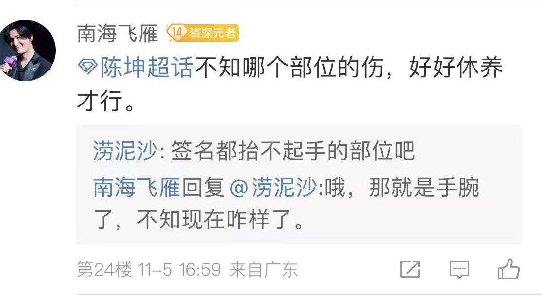 陈坤没有透露具体在拍摄哪一部作品时受伤,而陈坤的粉丝就表示,他此前一度无法抬起手签名,推测应该是肩伤或者手臂手腕受伤。