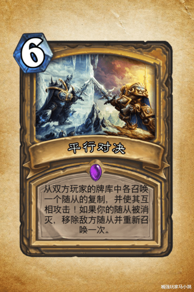 平行对决,6费,从双方玩家的牌库中各召唤一个随从的复制,并使其互相攻击!如果你的随从被消灭,消灭敌方随从并重新召唤一次。