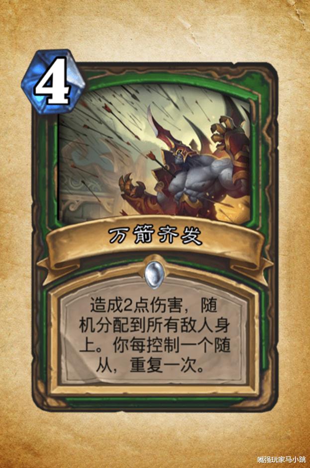 万箭齐发,4费,造成2点伤害,随机分配到所有敌人身上。你每控制一个随从,重复一次。