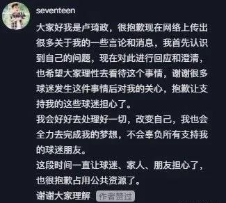 表示:很抱歉现在网络上传出很多关于我的一些言论和消息,我首秀认识到自己的问题,限制对此进行回应和澄清,希望大家理性去看待这个事情。嘻嘻很多球迷在这个事情后对我的关心,抱歉让支持我的球迷担心了。