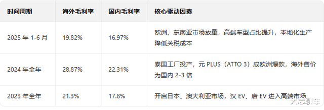 更关键的,是出海毛利率也很不错,比亚迪的财报里面就披露了详细数据,海外业务毛利率在19.82%,单车净利润在3万以上,并且今年上半年,海外毛利率居然高出国内毛利率达到19.82%,而去年全年的毛利率,海外也都是比国内高的,达到了28.87%,这个数据,意味着海外的利润是要远大于国内的。