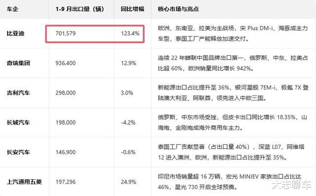 首先,就是比亚迪的海外战略布局非常乐观,海外销量正在呈现出爆发式增长的趋势,1-9月份的出口量,比亚迪达到了恐怖的70.15万辆,同比大增了123.4%,仅次于隔壁的奇瑞汽车,人家的出口数据93.64万辆,这个成绩面前,足以说明比亚迪海外有多受到欢迎了,要知道这个成绩,是在短短两年时间里面就创造的。