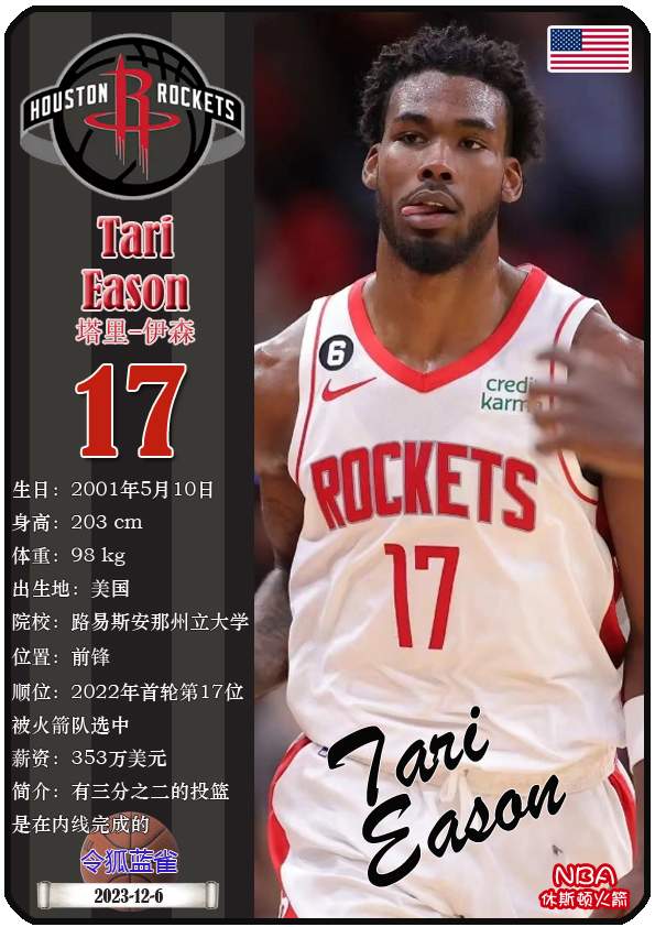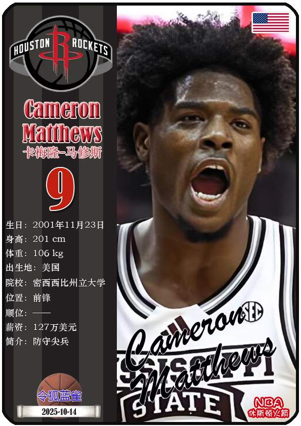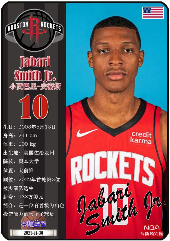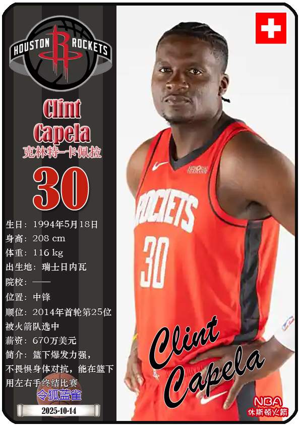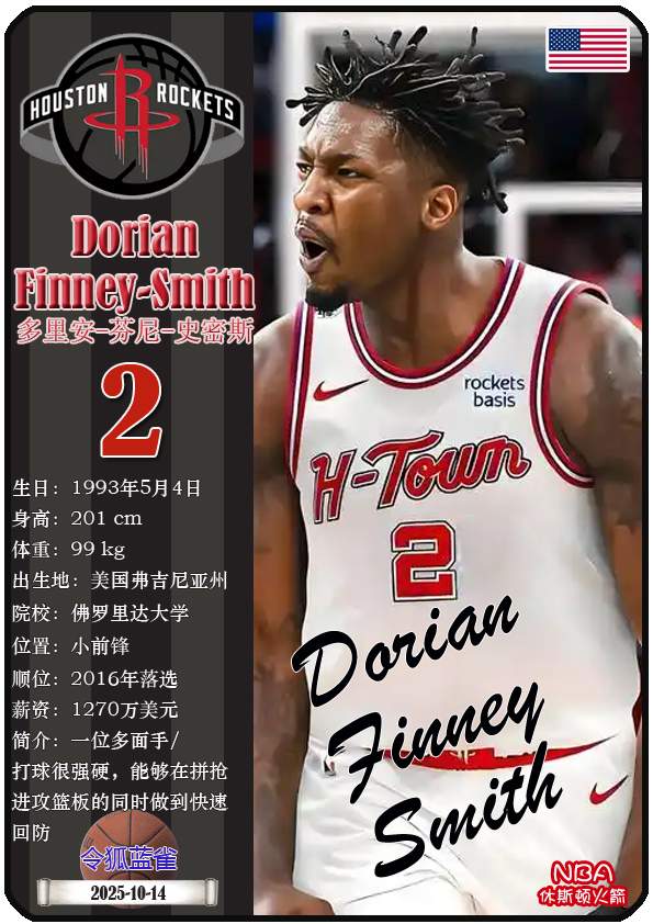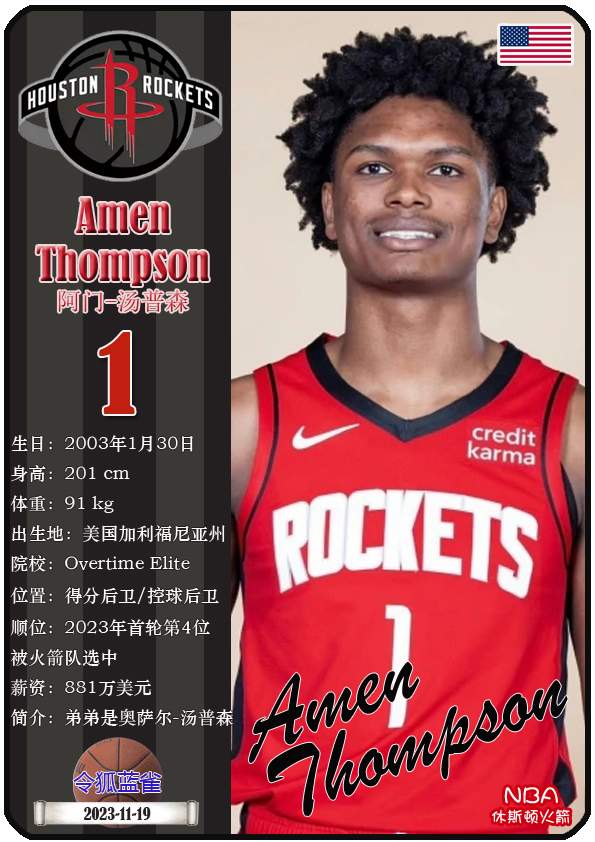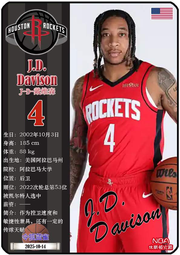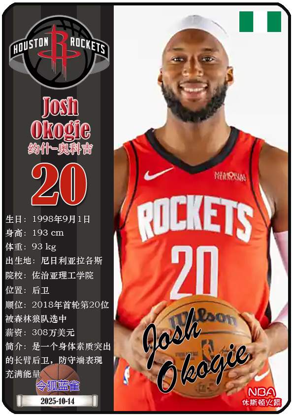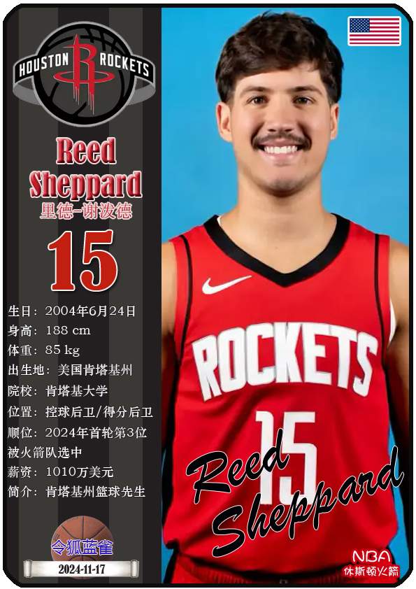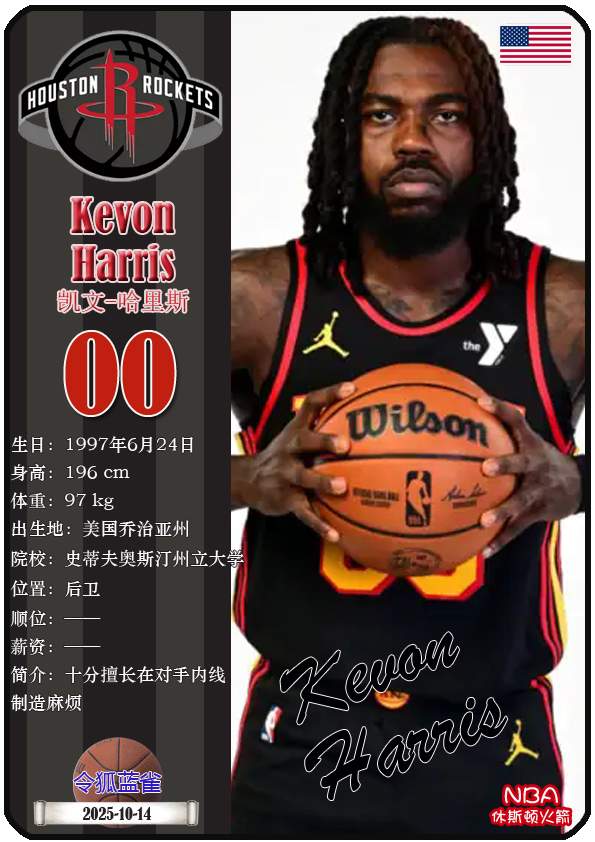 NBA休斯顿火箭队成立于1967年,距今已有58年历史。本赛季凯文-杜兰特由太阳队转会至火箭队。截至2025年10月14日,球队主教练是伊梅-乌度卡,队内拥有球员凯文-杜兰特、阿尔佩伦-申京、阿门-汤普森等。本期以球星卡的形式展示目前NBA休斯顿火箭队的17名球员(按球衣号码排序):