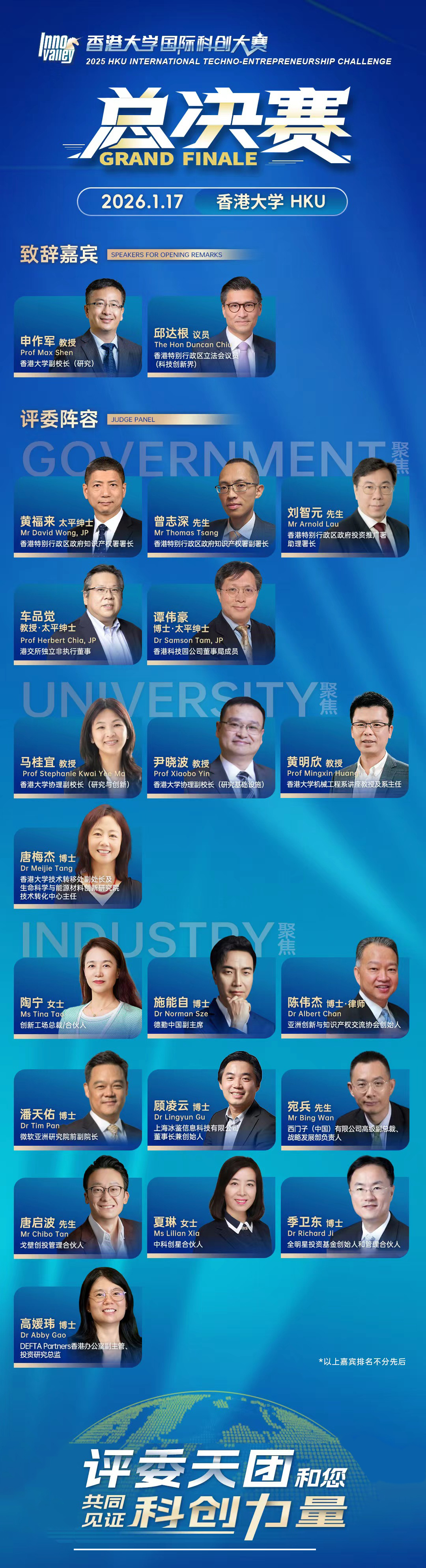 大赛组委会特邀政界要员、知名学者与前沿科创企业代表共同组成总决赛评审团。他们将以广阔的国际视野、精湛的专业能力与富有创见的洞察,为每一位参赛者提供指导,助力他们在科技创新之路上不断突破、勇攀高峰。
