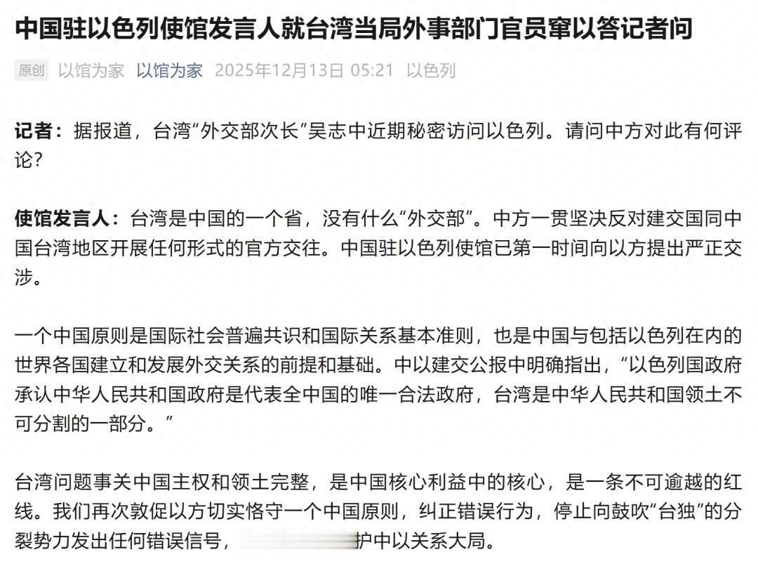 台湾当局外事部门官员秘密窜访以色列,我使馆:台湾没有“外交部”,已提出严正交涉