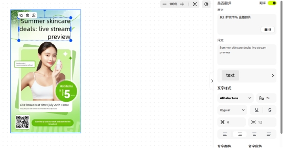 Canva为用户提供了一键式图片翻译的功能,在对图片中出现的文字内容进行识别之后,即可通过点击鼠标的方式将其转换成为其他语言的内容,并且支持多达20种不同的语系选择,在使用这款工具完成图片翻译工作时,也可以直接结合其中的各种插件模块来进行相应的设计调整,一边翻译一边设计。