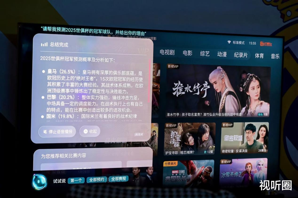 此外,海信在AI应用领域持续创新。正值2025年FIFA世俱杯,消费者通过海信"体育智能体"体验到了"深度玩赛"的全新观赛乐趣,这或许给球迷朋友带来了最为别样的感受。例如,海信电视能实时分析赛场动态,为球迷提供智能赛程推荐、战术拆解甚至胜率预测。AI驱动下的大屏社交也正中球迷下怀:用户可通过语音指令调取赛事历史数据对比,或生成专属集锦片段即时分享社交平台——这种“第二现场”体验和AI带来的“玩法”革新,成功激活了换机热情。