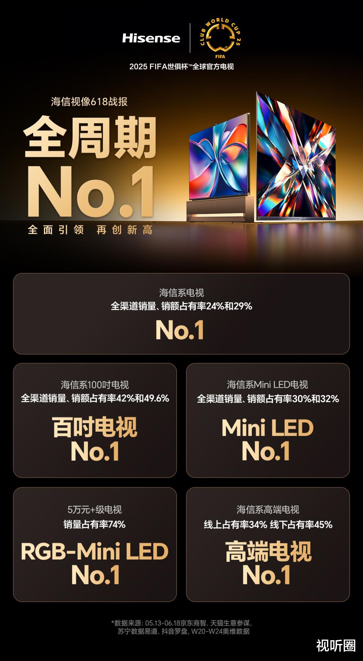 海信系电视全渠道销量、销额市占率分别为24%和29%,中国第一;
