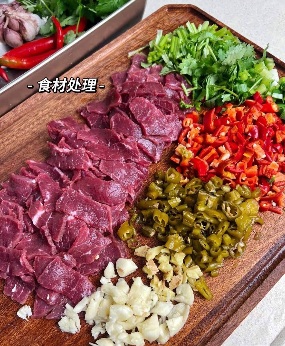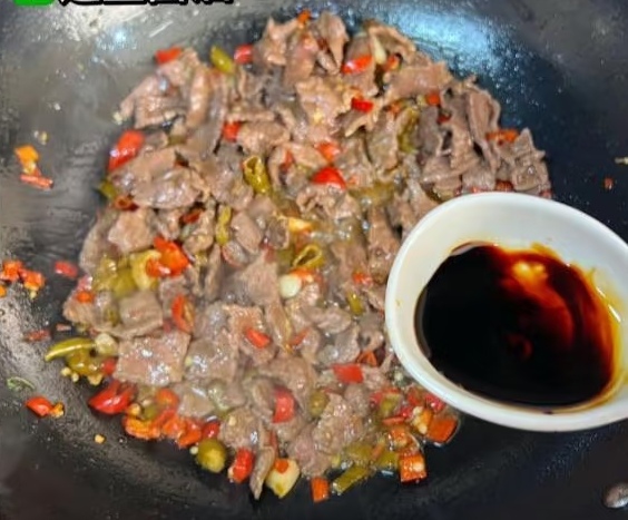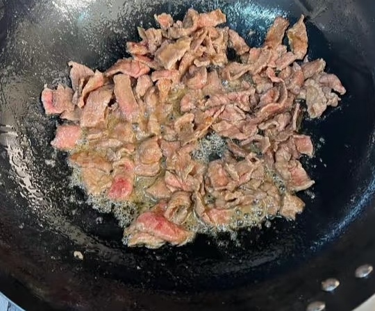 - 热锅凉油,油热后加入腌制好的牛肉片,快速翻炒至变色后取出备用。