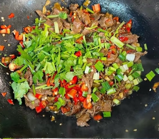 - 加入切好的香菜段,快速翻炒至香菜稍微软化。