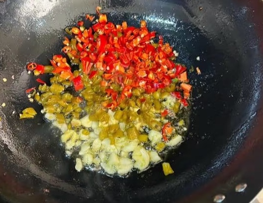 - 锅中留底油,放入蒜片、姜末、泡椒和小红椒圈爆香。