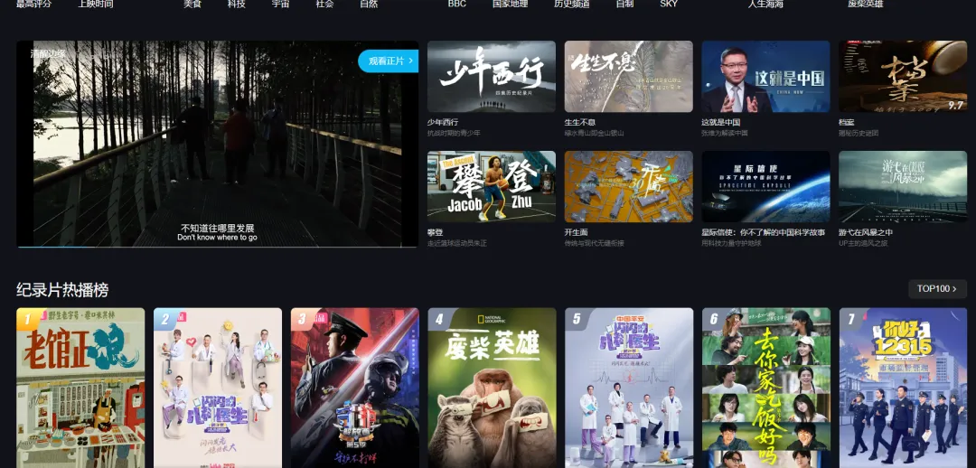 3. B站纪录片频道网站链接:https://www.bilibili.com/documentary关键词:年轻向、弹幕互动、免费 + 会员结合B站的纪录片频道绝对是 “宝藏”!既有《人生一串》《守护解放西》这种接地气的国产片,也有《但是还有书籍》《人生果实》这种治愈系海外片,部分免费可看,会员片库也只要几十块钱就能承包一整年。最特别的是 “弹幕氛围”—— 看《人生一串》时,满屏 “深夜放毒”“馋哭了” 的调侃,比独自看片有趣多了;而且B站还会搞 “纪录片周”,定期推出主题合集,比如最近的 “自然疗愈特辑”,直接帮你打包好片单。