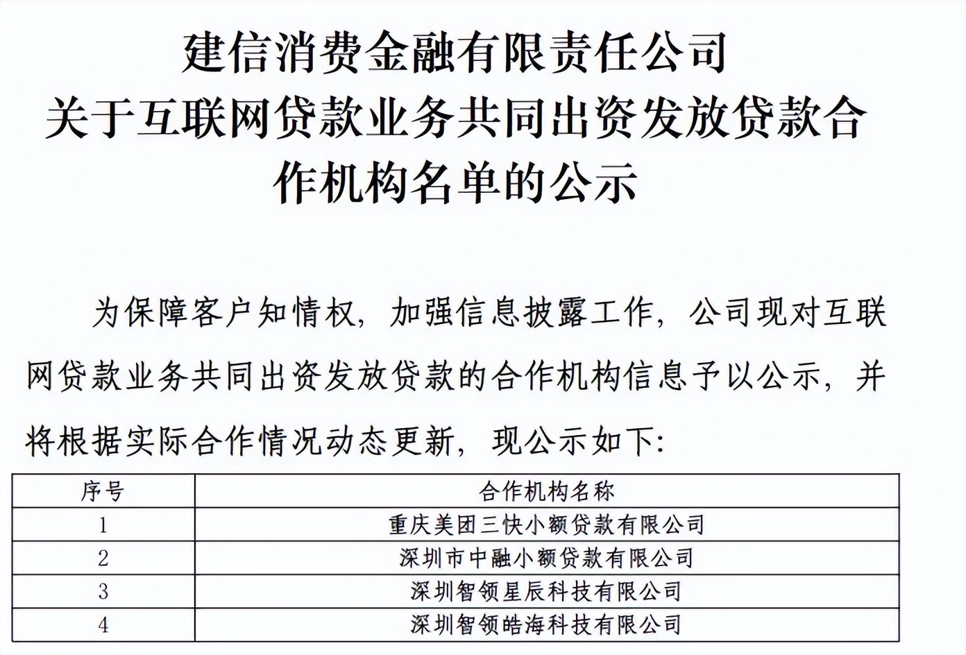 其中,建信消金披露的是联合贷业务合作机构名单,有4家机构:重庆美团三快小额贷款有限公司、深圳市中融小额贷款有限公司、深圳智领星辰科技有限公司、深圳智领皓海科技有限公司。