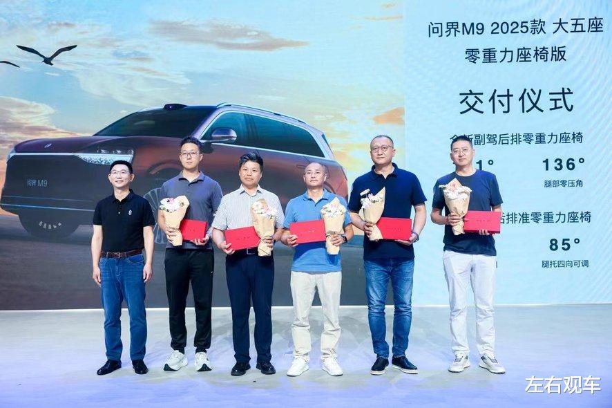 本次活动中交付的问界M9 2025款大五座零重力座椅版,副驾后排采用全新零重力座椅,一键展开后可带来121°的腰部零压角和136°的腿部零压角,让用户享受漂浮云端般的惬意;主驾后排全新准零重力座椅靠背最大可调节至60°,腿托四向可调,最大可调节至85°,把舒适度拉到“头等舱”级别。