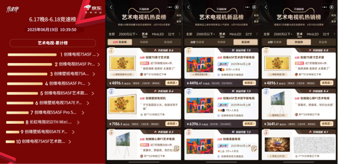 种种工艺的叠加,让创维在壁纸电视赛道上几无对手。2024年,创维成为壁纸电视中国销量第一的品牌。今年618期间,创维壁纸电视销量同比增速高达120%,实现了爆发式增长;京东艺术电视品类累计榜,创维壁纸电视独揽了9席;天猫艺术电视热卖榜、新品榜前三名,以及热销榜前2席,也被创维悉数包揽。从小红书平台数据来看,创维壁纸电视也是电视品类热度最高的产品阵营,持续受到小红书平台的用户喜爱。