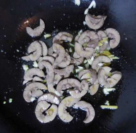 3.炒制猪腰子:锅中倒入适量的植物油,加热至5成热,放入腌制好的猪腰子,快速翻炒,直到猪腰子变色,捞出备用