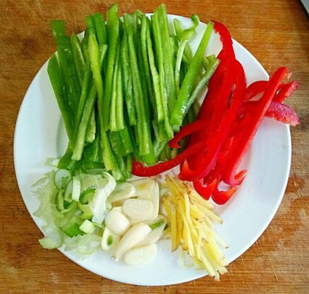 2.准备蔬菜:青椒和红椒洗净,切成与猪腰子相似的大小,蒜瓣拍碎,姜切片,葱切段