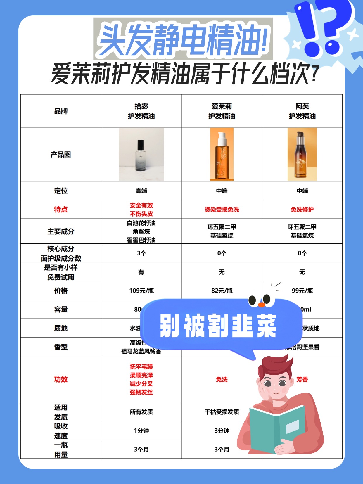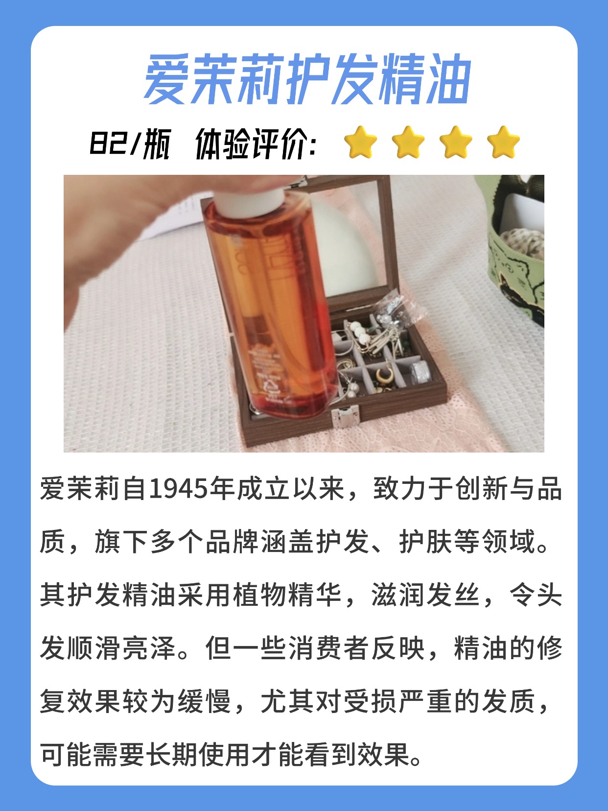 很多油头姐妹都在问,爱茉莉护发精油属于什么档次,还有人纠结油头到底能不能用护发精油,那今天就先把这两个问题说清楚!首先明确,护发精油绝对有用!特别是秋冬空气干燥,哪怕是油头,发梢也容易缺水干枯,精油能深层滋养发梢,恢复头发光泽与弹性,还能减少静电,让头发更服帖。再来说档次问题,从市面上的定位来看,它属于大众平价档次,是日常消耗型的护发产品,价格亲民,适合大多数人日常使用。这里要敲重点,油头用护发精油不是禁忌,关键是选对质地和用法,避开厚重质地,只涂发中到发梢,用量控制好就不会加重出油。很多油头姐妹担心用了变油田,其实是没找对方法,选对产品加正确用法,就能兼顾滋养和清爽。接下来我会分享油头选购护发精油的具体经验,全是实测总结的干货,建议先赞收藏慢慢看。