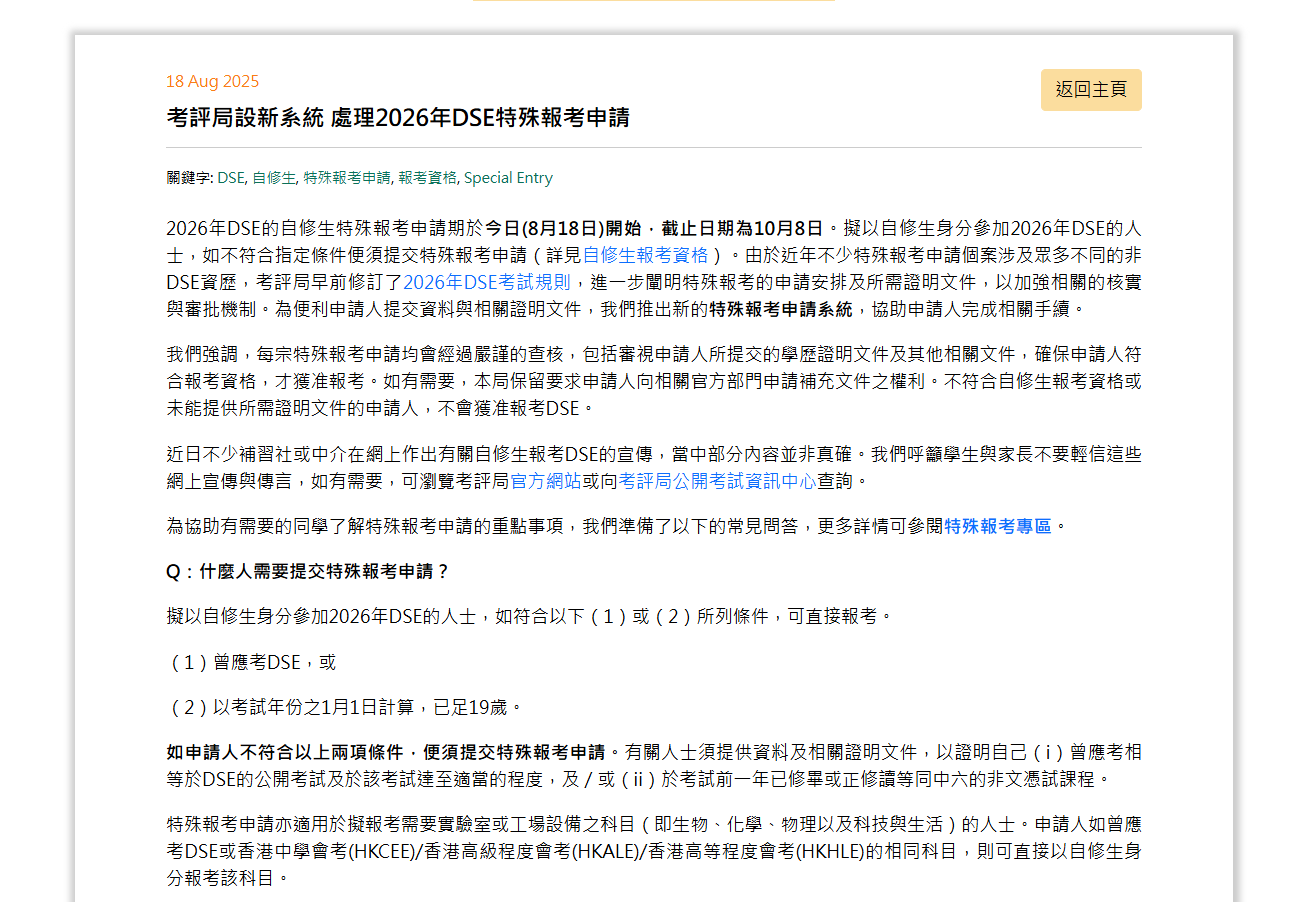 DSE考生一般分为“日校生”(在校生)和“自修生”。根据最新规定,自修生除了须满足“曾参加过DSE”或“考试当年1月1日年满19岁”的条件之外,若两者均不符合,则须通过“特殊通道”递交申请。