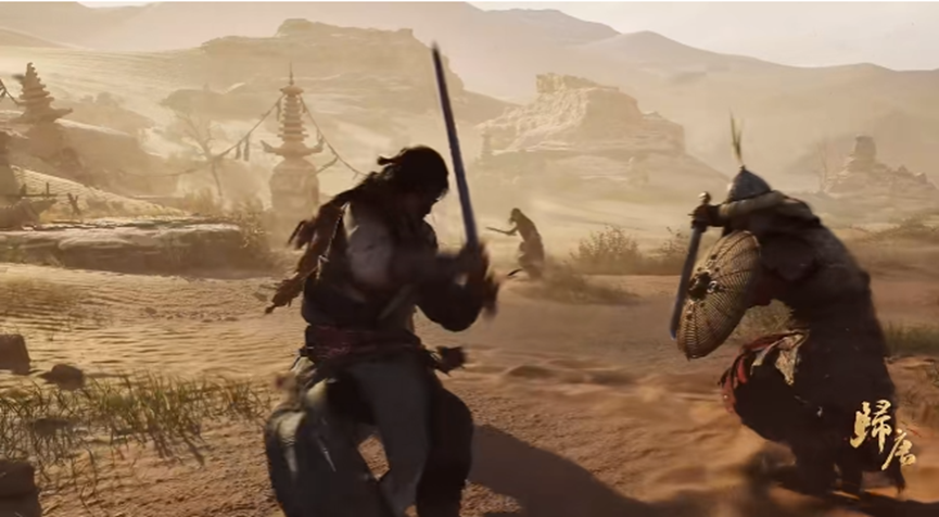 《归唐》是一款动作冒险游戏,其打斗场面更注重写实,堪称暴力美学教科书,就拿2分20秒的战斗场景来说。PV里主角手持横刀,在漫天黄沙中与吐蕃势力对砍,每一刀下去血液飞溅,被攻击时的躲避动作灵活,在地上翻滚几圈后又开始战斗,整个画面都很丝滑。巴西猴粉看完这段打斗激动得不行:“哇塞兄弟!这操作简直行云流水!”