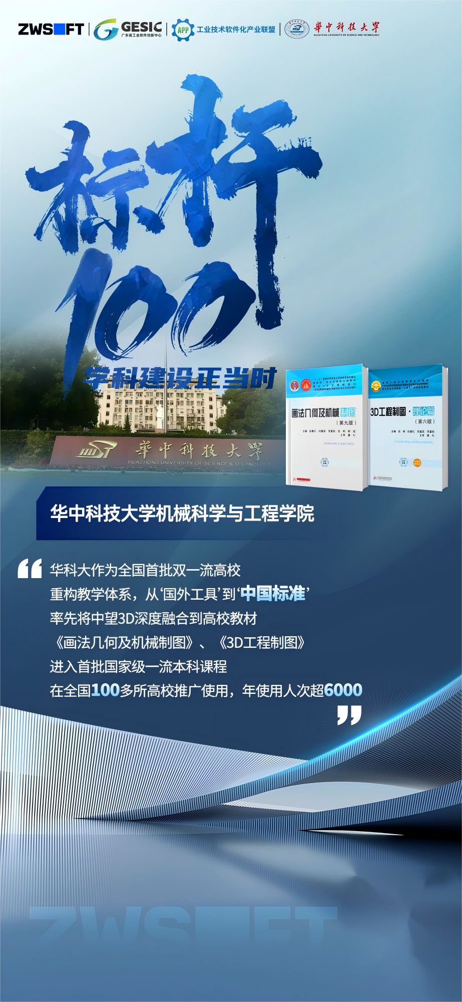 罗年猛介绍,图学教育研究与发展中心主编的《画法几何及机械制图》(由阮春红、张俐、何建英、李喜秋联合编写)、《3D工程制图》(由张俐、阮春红、何建英、李喜秋、韩斌联合编写)两套教材,已成为全国首批深度融合中望3D软件的高校教材,进入首批国家级一流本科课程,在华中科技大学、解放军海军工程大学、昆明理工大学、武汉科技大学、解放军陆军工程大学、江南大学、武汉轻工大学、武汉工程大学、山西大学、浙江师范大学、青岛理工大学、安徽建筑大学、湖南工商大学、中南民族大学、河南科技学院、桂林航空工业学院、山西工学院、湖南文理学院、武昌工学院、武昌首义学院等全国100多所高校推广使用,得到师生的广泛好评,年使用人次超6000。