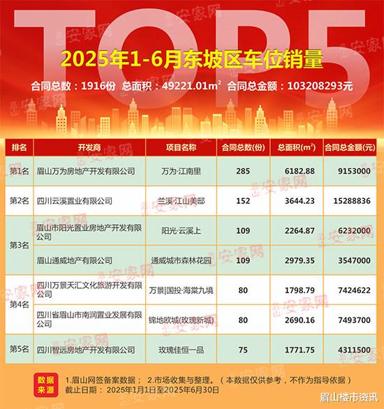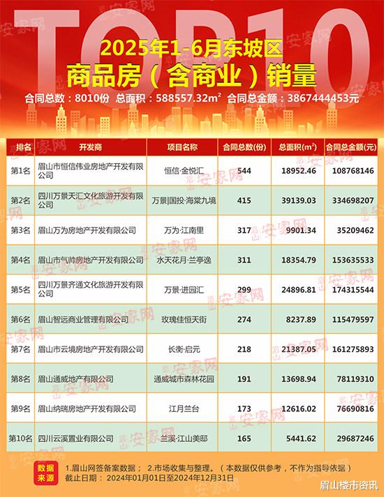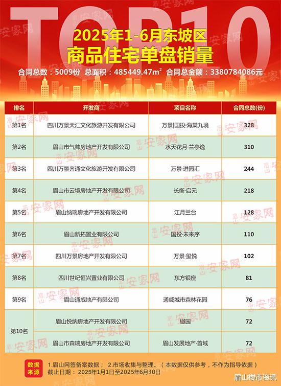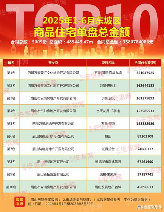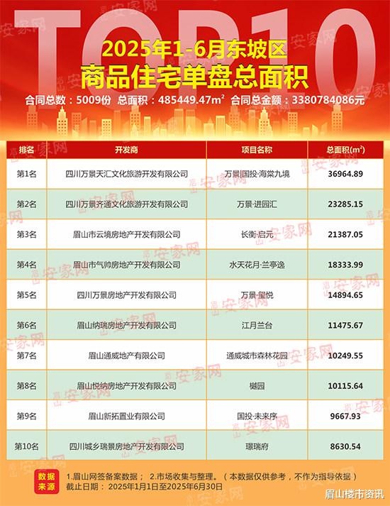 2025年1-6月眉山(东坡区)新房住宅成交5009套,总成交面积485449.47㎡,成交总金额3380784086元,剔除安置房后,商品住宅成交均价7330.69元/㎡;