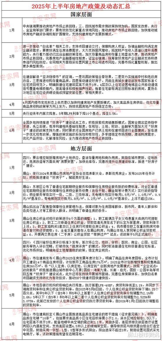 2025年上半年房地产市场以“止跌回稳”定调,陆续开展了几个层面的工作,一是政策端持续加码,促进购房消费,加快房企融资化解风险,提振市场信心。二是推动建设好房子试点,加大高品质住房供给,激活更多改善型购房需求。三是加大存量房、存量土地盘活力度,推动回购存量商品房配售配租,提高保障性住房供给,加速去库存。为此笔者根据上半年国家层面以及眉山本地的政策进行了回顾梳理,详情如下表:
