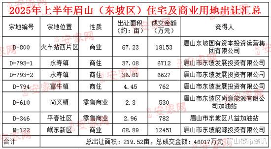 2025年上半年,东坡区土地市场共有7宗商住及商业用地成交,总出让面积为219.52亩,同比下降60.05%,成交金额约4.6亿元,同比下降28.9%。7宗地竞得人均为国有平台公司。成交详情见下表: