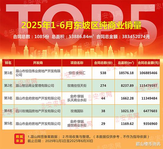 2025年1-6月眉山(东坡区)商业成交1085套,总成交面积53886.84平方米,合同总金额383452074元,成交均价7115.88元/㎡;