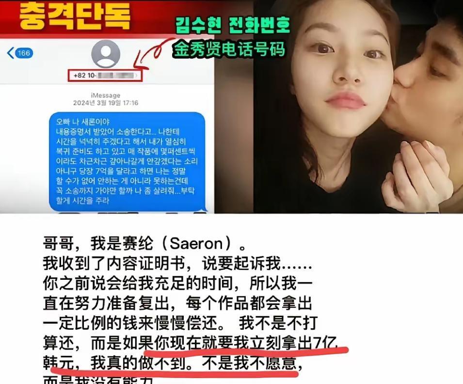 金秀贤这波塌房真是越扒越有料! 最近闹得沸沸扬扬的"金秀贤逼死前女友"大戏又有新番了,金赛纶生前被拍到和金秀贤贴脸亲亲的照片全网疯传。 这姑娘生前在经纪公司白天给新人当表演老师,晚上还得给金秀贤当"隐形女友",累死累活连加班费都没见过。 最离谱的是分手后还被追着要7个亿的债,逼得小姑娘走投无路。