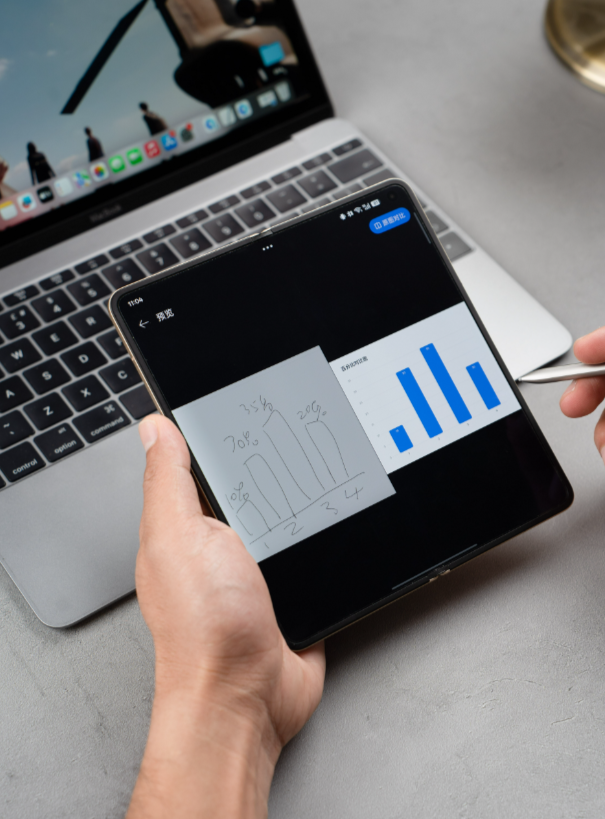 比如我平时看剧、看球赛,展开大屏确实爽,但以前总觉得为了那几分钟的爽,每天得多操一份心,不值当。现在不一样了,因为它用着没负担,我反而开始习惯性地多用大屏——开会看PPT,不用再眯着眼放大缩小;一边回老板消息一边查资料,分屏操作顺得像开了外挂;有时候随手记点灵感,配合手写笔在大屏上写写画画,那种流畅感直板机真给不了。