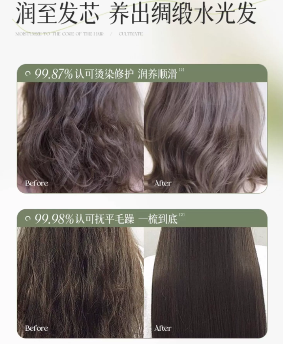 1800 例临床测试数据显示,85.7% 的用户使用 20 天后,断发分叉明显减少,发根稳固力上升 89%;87.2% 的用户使用 21 天,断发减少 55%,使用 28 天,断发减少 85%;使用 60 天,发丝强韧度、柔顺度、光泽度整体提升 83%。第三方权威测评验证,98% 的用户使用 28 天后,发质问题得到明显改善,哪怕是常年烫染的重度受损发质,也能实现稻草头逆袭水光发。
