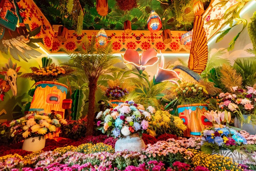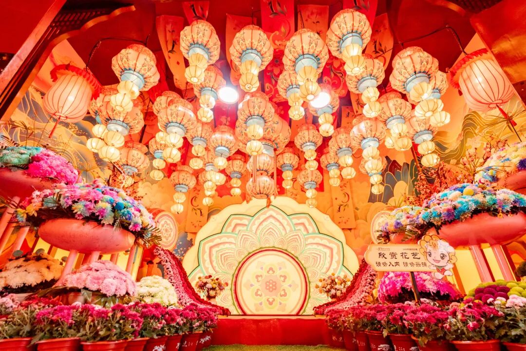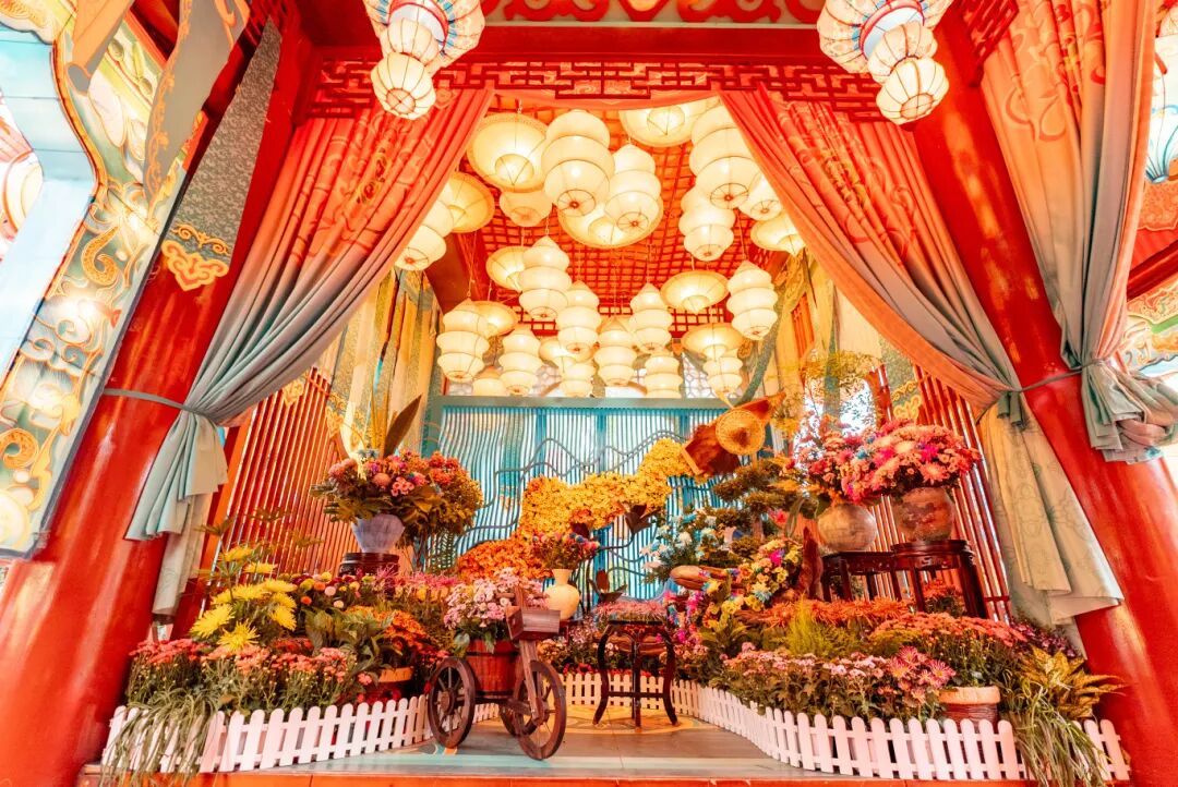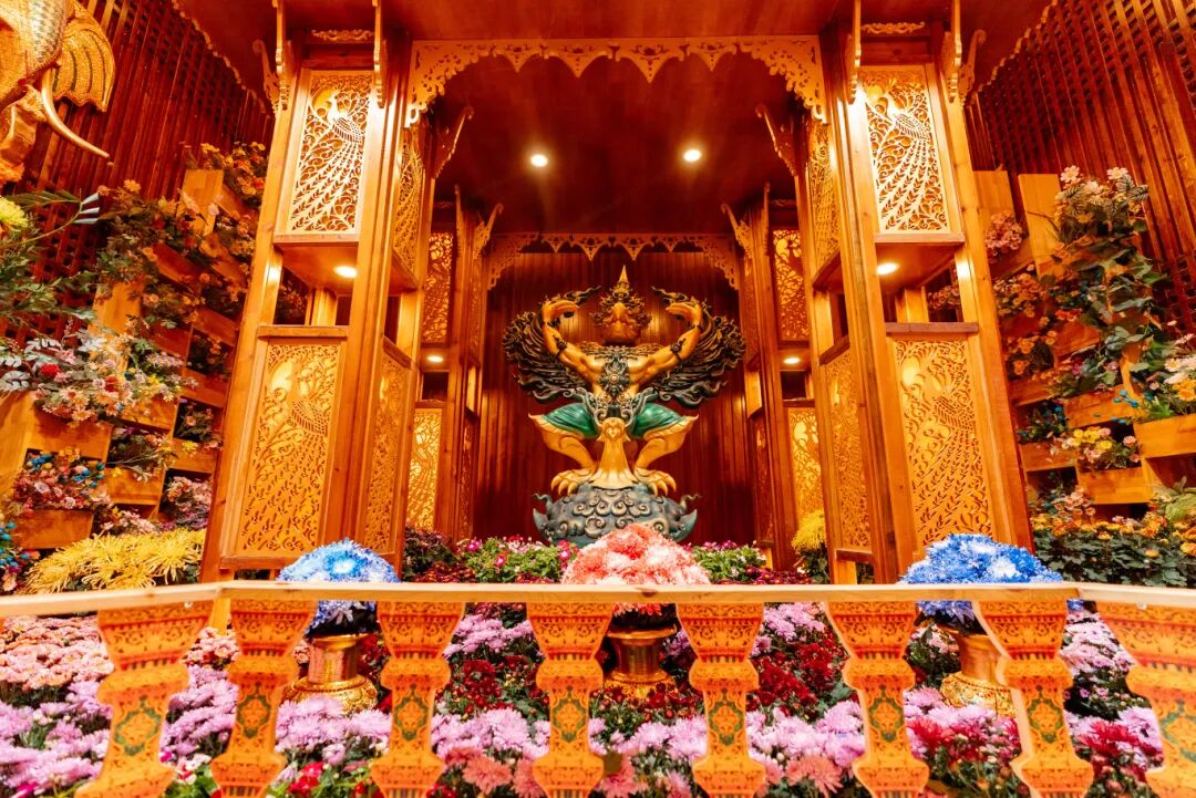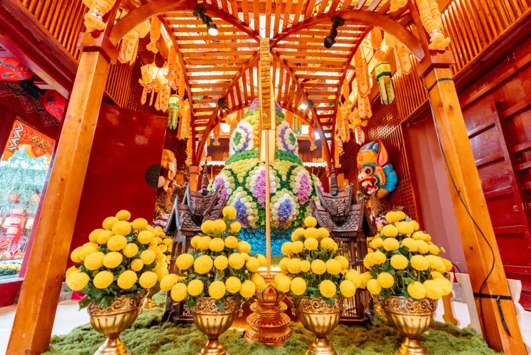 东南亚馆将泰国传统建筑与菊花巧妙结合,搭配泰国传统花卉布置风格和丝绸花布等装饰,营造出浓郁的泰国风味氛围,仿佛让人踏上了一片充满异域风情的热带土地。