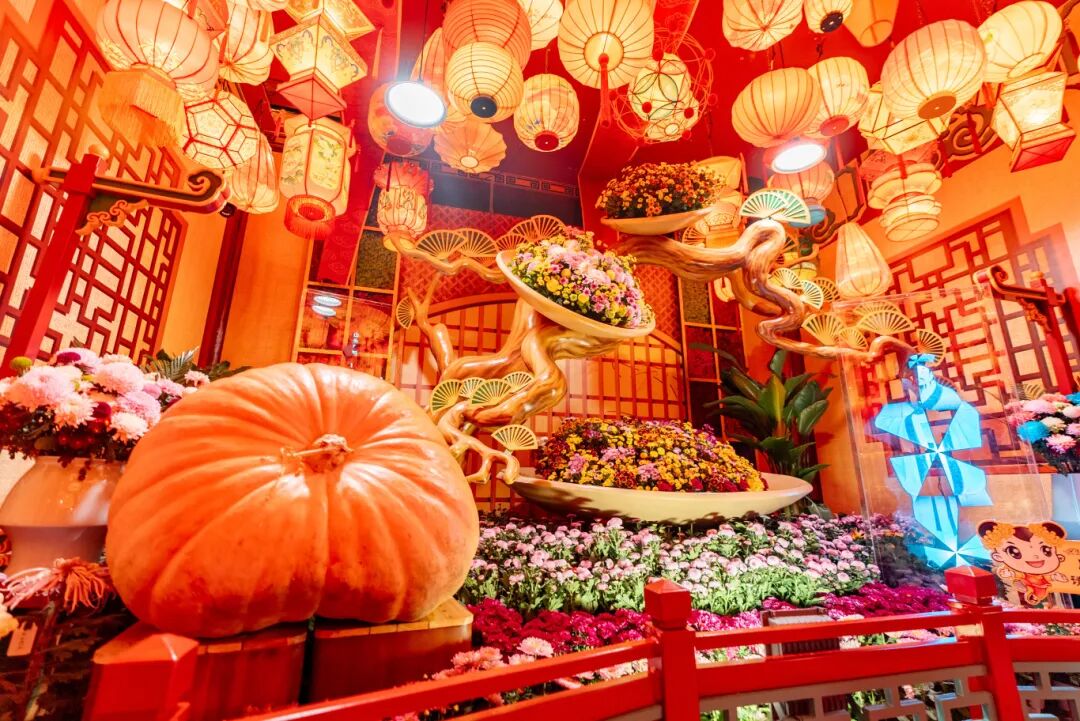 中国馆以瓷载道,灯映秋华,通过陶瓷工艺与菊花艺术的完美结合,重现了《东京梦华录》中的宋式雅韵,一卷立体的东方美学长卷在眼前徐徐展开,献礼盛世中华的璀璨华章。