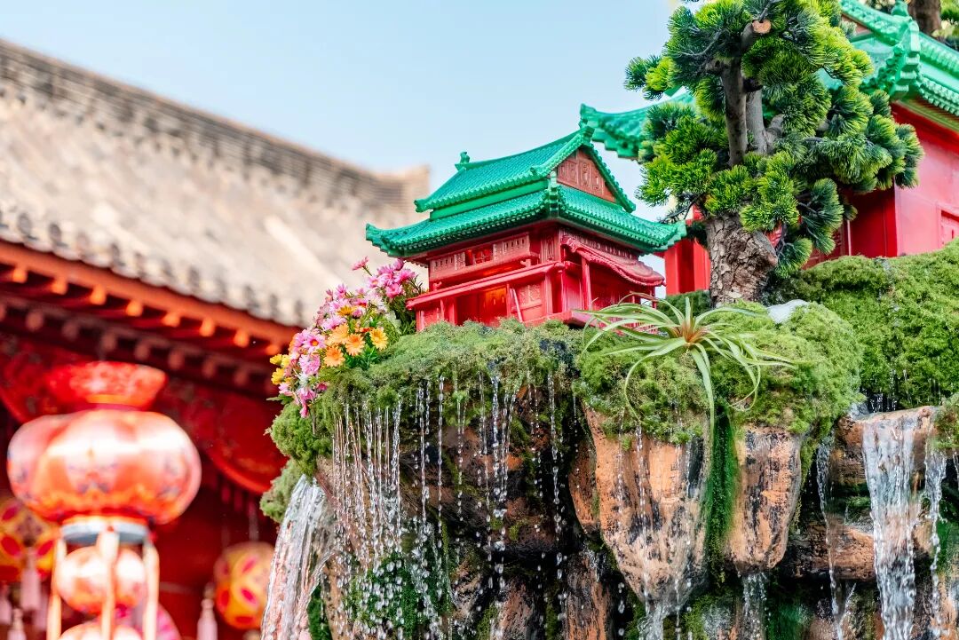 菊文化馆以传统门廊为文化容器,连接历史庆典与当代节庆美学,展示梅兰竹菊、宋代点茶、青绿瓷盘等,呈现中式传统菊艺与现代美学的完美融合,让人在欣赏菊花的同时,感受到传统文化的深厚底蕴。