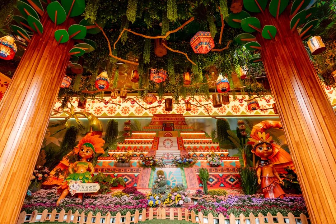 美洲馆以玛雅金字塔雕纹阶梯耸立,以玛雅建筑为时空容器,呈现出“粗犷与柔美”的强烈风格对比,热带雨林的狂野诗意扑面而来,让人仿佛置身于神秘的美洲大陆。
