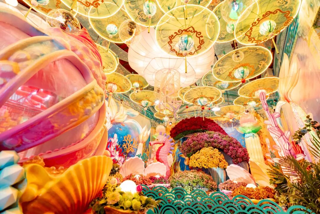 鱼灯馆以菊花为媒,构建奇幻的海底童话世界,融合海洋生物元素与童趣景观,打造沉浸式浪漫体验,传递自然奥秘与想象之美,仿佛让人置身于一个梦幻般的海底王国。