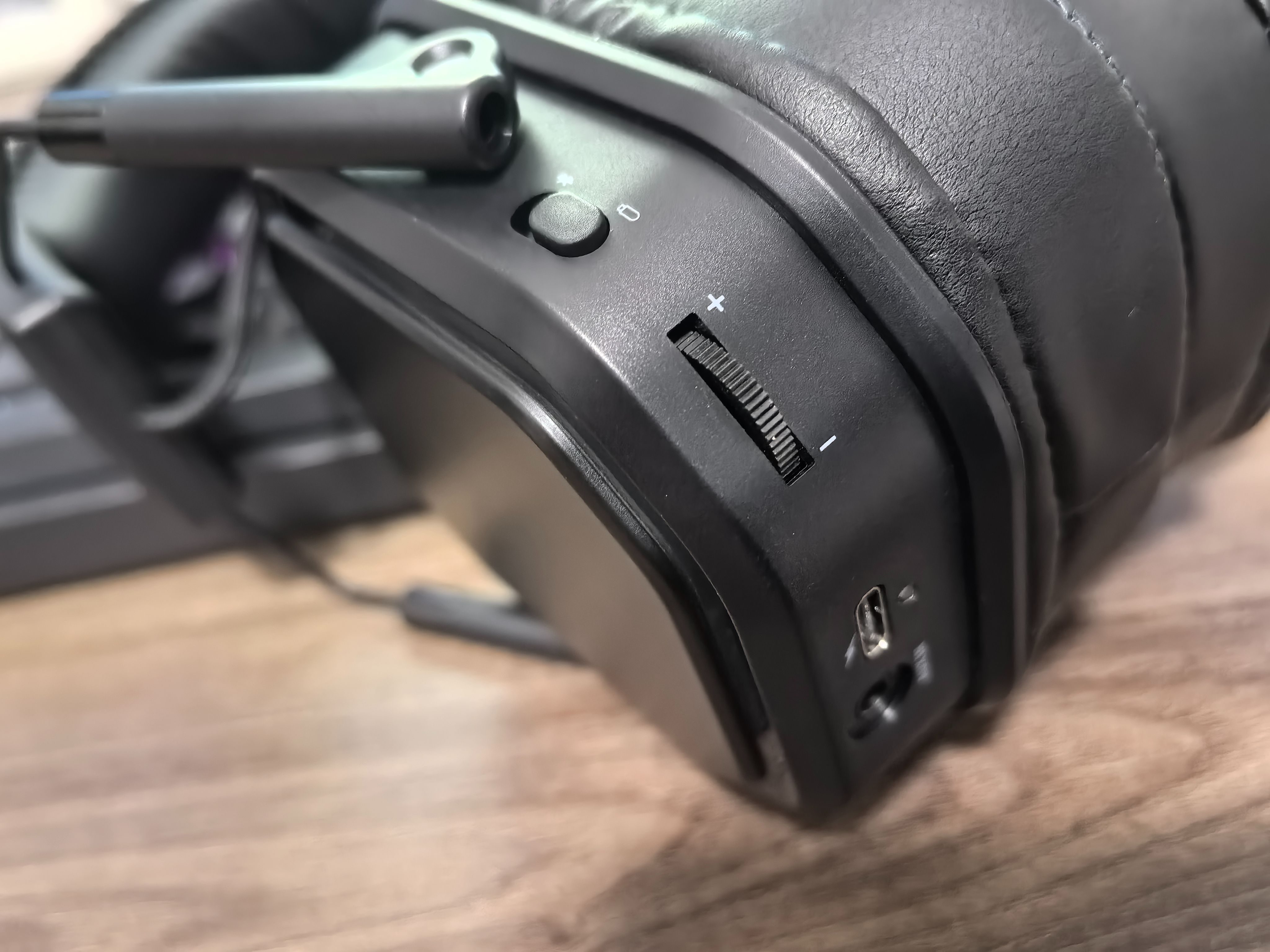虽然说头戴式耳机也追求轻量化,但与TWS耳机相比,重量的影响便不那么重要。所以雷柏 VH850的操控都以物理按键的方式来实现:包括连接模式调节开关、音量调节滚轮、Type-C充电口、3.5mm音频输入接口、麦克风插孔以及灯光开关。这样独立设计的好处就是不会造成误碰,且容易上手,实现完全盲操的体验。