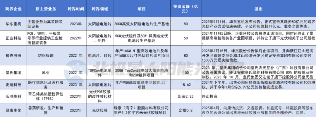 梅耶博格的失败并非孤例,而是近年来光伏行业跨界热潮退去后的普遍现象。在2022年前后的光伏景气周期中,赛道红利吸引了大批 “门外汉” 涌入。据北极星不完全统计,2022年至今跨界布局光伏的企业高达数十家,主营业务涵盖医疗、兽药、玩具、服饰等截然不同的领域,缺乏对光伏产业链复杂度、技术迭代速度与产能周期的深刻认知。
