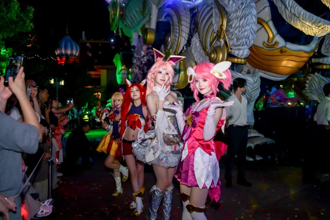 花车游行结束后,园区内还举办了以《金铲铲之战》女子赛为主题的烟花秀、无人机表演,来庆祝新王的诞生……女子赛为公园的庆典氛围增添了别样的看点,而公园本身以及所有游客,都成为了「为新王加冕」的见证者和欢呼者。