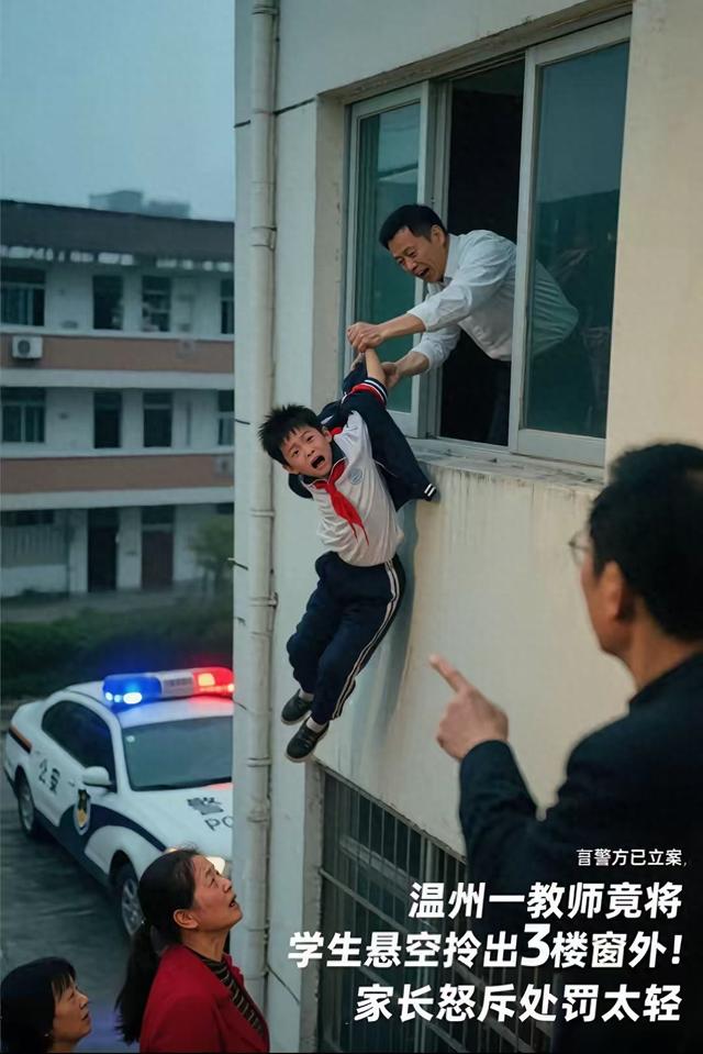 近日,温州某小学教师将一名学生悬空拎出3楼窗外的视频引爆全网。画面中,学生身体完全悬空,仅靠教师单手拽住衣领,脚下是约9米高空(相当于3层楼高度)。网友们纷纷质问:"这是老师还是土匪?是学校还是黑社会?"